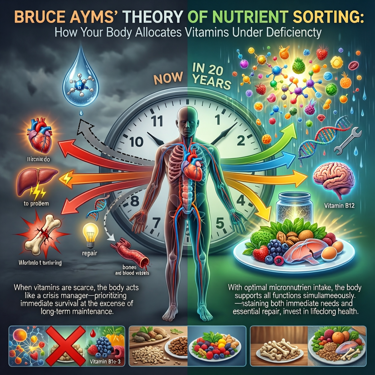 Эймс заимствовал термин "triage" из военной медицины — это система сортировки раненых на поле боя по степени срочности помощи. Перенося эту логику на биохимию организма, он сделал поразительное открытие: наш организм распределяет ограниченные ресурсы витаминов и минералов по точно такому же принципу выживания.
