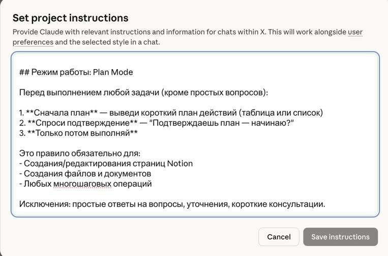 ? Простой хак в настройках и Claude начинает работать как нормальный исполнитель, а не как тупой стажер. Проблема: Claude любит сразу бежать делать. Просишь поправить Notion — он уже там что-то меняет. Просишь файл — уже создал три. А потом «упс, я понял задачу не так». Решение: project instructions с режимом Plan Mode. Захожу в настройки проекта → Set project instructions → вставляю: Режим работы: Plan Mode Перед выполнением любой задачи (кроме простых вопросов): 1. Сначала план — выведи короткий план действий 2. Спроси подтверждение — «Подтверждаешь план — начинаю?» 3. Только потом выполняй Обязательно для: – Создания/редактирования страниц – Создания файлов и документов – Любых многошаговых операций Что кайфово: — Claude показывает план до того, как начнёт ломать — Можно подправить направление сразу, а не потом откатывать — Работает в любом проекте, один раз настроил — работает везде В Claude Code это встроено по умолчанию. В веб-версии — добавляешь руками. 5 минут настр