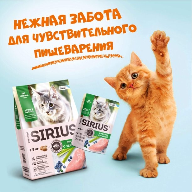 Избирательность в еде, урчание в животе, повторяющаяся рвота, снижение аппетита или даже отказ от корма — сигнализируют о возможных проблемах с ЖКТ питомца. Чувствительное пищеварение требует особого подхода к выбору рациона. В SIRIUS мы верим: забота начинается с понимания. Именно так появился корм премиум-класса SIRIUS для кошек с чувствительным пищеварением «Индейка с черникой» — мягкий и сбалансированный: