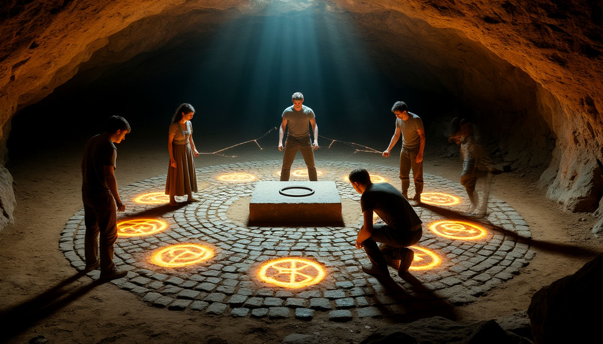 Когда мы «проиграли» все семь нот, вернувшись в итоге к центральному «солнцу», все семь символов на полу слабо светились в темноте, образуя круг. И в центре этого круга, там, где только что была спираль, теперь отчётливо проступили контуры… люка? Небольшой, квадратной каменной плиты с кольцом для подъёма.