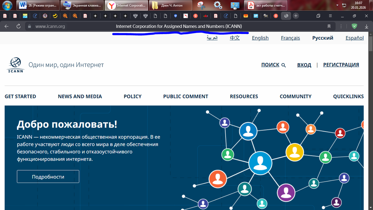 Получаю доступ на земле через World Wide Web (Всемирная Компьютерная Сеть) в информационно-телекоммуникационную сеть Internet («Интернет») и через соответствующую поисковую систему (браузер) на страницу сайта URL - адрес: https://www.icann.org/ru Internet Corporation for Assigned Names and Numbers (ICANN). Фотографию от 20.01.2026 г. сайта прилагаю следующую. Далее на странице сайта URL - адрес: https://translate.google.ru/?sl=auto&tl=ru&op=translate Английские слова: Internet Corporation for Assigned Names and Numbers перевожу на Русские слова: Интернет-корпорация по присвоению имен и номеров. Еще далее на странице сайта URL - адрес: https://www.icann.org/locations опубликовано Местонахождение ICANN ГЛАВНЫЙ ОФИС Лос-Анджелес, Калифорния, США. - Интернет-корпорация по присвоению имен и номеров (ICANN) — это международная некоммерческая корпорация, которая отвечает за распределение адресного пространства интернет-протокола (IP), присвоение идентификаторов протоколов, управление систем