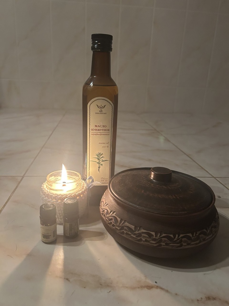 В моей жизни есть ритуалы. Например, чашечка кофе, сваренного в турке на сливках с добавлением ложечки топленого сливочного масла и вприкуску две кураги. Но сейчас я хочу поделиться еженедельным ритуалом SPA, который требует подготовки, но при этом, можно провести в домашних условиях. Я забрала его из Аюрведы. Если мы пока не едем в Индию на аюрведические процедуры, то она приходит к нам домой. Еженедельно в свой один из выходных дней я не ленюсь, а проделываю рутинные подготовительные мероприятия, чтобы позаботиться о себе. На подогревающемся полу в ванной комнате расстилаем 2 махровых полотенца. Они специально выделены для этих процедур. На маркетплейсе куплено базовое кунжутное масло. В специализированных магазинах заказаны эфирные масла, которые приятны моему вкусу, белый грейфрут, например. В специальном глиняном горшке на водяной бане я разогреваю кунжутное масло до горячести. В горячее базовое масло капаем несколько 6-8 капель эфирного масла. Зажигаем свечи и в приглушенном свет