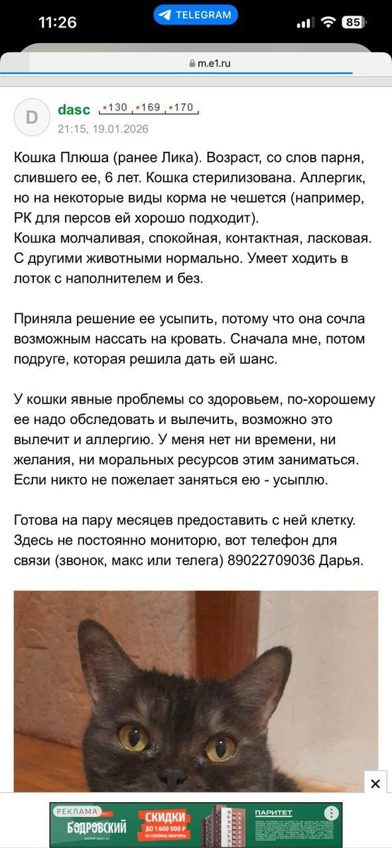 ‼️В Екатеринбурге "хозяйка передержки" ищет тех, кто может заняться "забытой" на передержке кошкой, если кошку не заберут, "хозяйка" обещает ее усыпить. "Хозяйка" выложила пост на одноименном форуме на e1 https://www.e1.ru/talk/forum/read.php?f=130&i=3749532&t=3749532 Понимаю, что не совсем по адресу пишу. Но ситуация жуть, конечно. Если кто-то найдется, кто сможет забрать кошку, от себя помогу с оплатой первичных анализов, поделюсь кормом на первое время. "Хозяйка" обещает дать на пару месяцев клетку.‼️ ☎️Телефон "передержки-зоогостиницы" во второй картинке. П.С. У нас тоже полно зассанцев. Взять хоть кота-основателя Захара...А еще Брунгильда и Тринадцатая. Матильда, слитая мне, ни разу в жизни не попала в лоток по-большому.