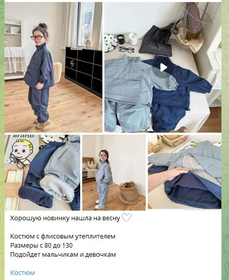 В Telegram много каналов с подборками, но важно смотреть не только на внешний вид. Например, вот такой костюм сегодня рекомендовал один из каналов: полностью синтетический. Верх — полиэстер, подкладка — полиэстер. Материал не тянется, молнии нет, поэтому придется всё время снимать и надевать через голову. Ребенку будет то жарко, то холодно, из-за синтетики спина и попа быстро вспотеют. Пожалуйста не покупайте такое! При выборе детской одежды всегда советую оценивать состав, крой и практичность, а не только картинку. ❓А вы часто покупаете по рекомендациям из али-групп?