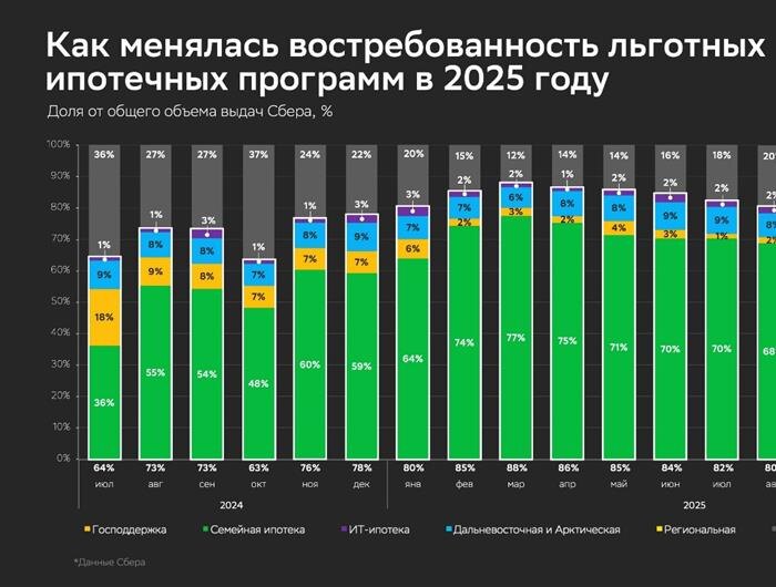 Динамика объёмов выдач по льготным программам по РФ за 2024–2025 гг. (данные Сбера). Динамика доли выдач по программе "Господдержка" показана жёлтым, по "Семейной ипотеке" — зелёным, по IT-ипотеке — фиолетовым, по "Дальневосточной и Арктической" — голубым, выдачи на общих (базовых) условиях показаны серым. Числовые значения показаны для случаев, когда значения превышают 1%. Данные по "Региональной ипотеке" по большинству месяцев не приводятся, поскольку доля выдач не превышает 1%.
