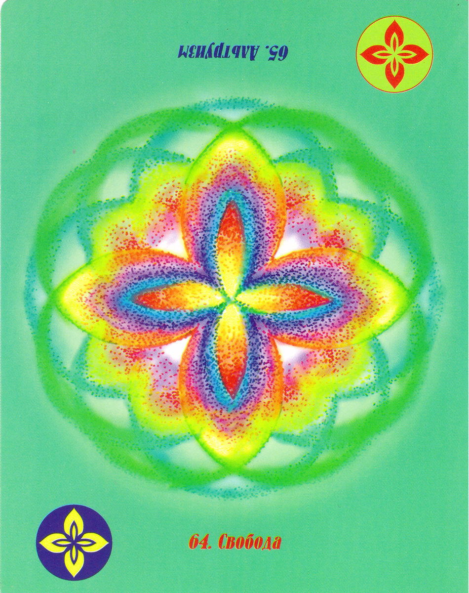 64 - СВОБОДА Ваша свобода — это не свобода от других, от мира или от действительности; это свобода от привязанностей. Освобождение состоит в отрешенности. Чем меньше вы идентифицируете себя с конкретными мыслями, чувствами и идеалами, тем вы свободнее. Всю жизнь вы были в плену условностей, воспитания, обучения. Теперь вы должны сбросить с себя это ярмо и понять, что вашей истинной сущностью никто и ничто обладать не может. Вы начинаете видеть сакральность добра и зла как частей одного целого. Когда вы уходите внутрь себя, вам не за что зацепиться и ничто не может ограничить это ваше состояние чистой свободы. Будьте собой, и вы станете свободны! ВЕРНИТЕСЬ К ИСТОКАМ Визуализируйте и чувствуйте свободу как лепестки лотоса, символизирующие реализацию вашей творческой жизни. Свобода говорит: «Откажись от всякого стяжательства и просто плыви по течению, ни за что не цепляясь и ни к чему не привязываясь. Наслаждайся разнообразием жизни, каждым ее мгновением». Аффирмация: Я становлюсь в