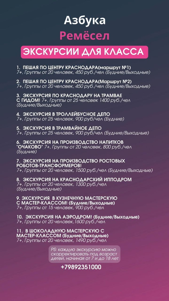 👇👇👇 Друзья, бронирование экскурсий для классов уже в разгаре!! 🔥🔥 Чтобы всем попасть на нужные экскурсии, позаботьтесь об интересных каникулах для детей уже заранее. Подробнее ознакомиться можно на нашем САЙТЕ ‼️ ✅А еще у нас есть однодневные туры! ➖➖➖➖➖➖➖➖➖ 🐐🌳в Усть-Лабинск + ферма коз 💦🚀В Архипо-Осиповку: музей космонавтики, хлеба + водопады 🕌Майкоп: в гости к Адыгам + чайные плантации 🧀Тур на сыроварню с мастер-классом Пишите нам в WhatsApp, Max 👇👇👇 wa.me/79892351000 @Экскурсии Азбуки Ремесел
