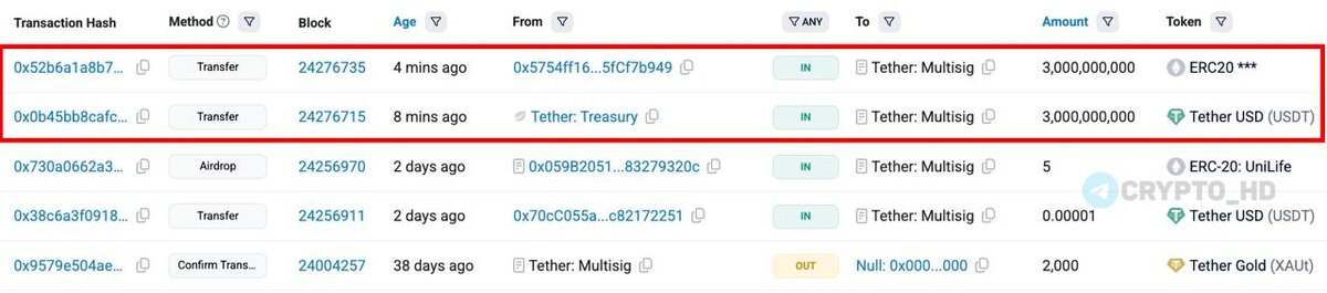 ❗️В Tether сожгли 3,000,000,000 USDT в сети Ethereum