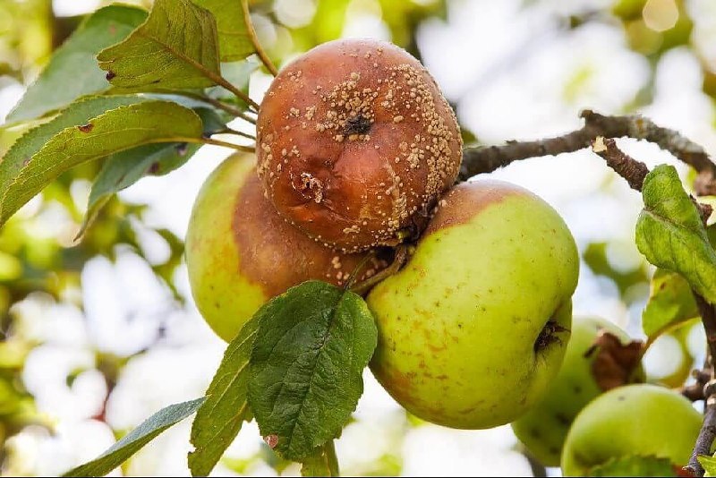 Чаще всего из‑за инфекционного заболевания — монилиоза (плодовой гнили). Сначала на ягодах и фруктах появляются белые налёты, потом плоды покрываются бурую пятнами и гниют.