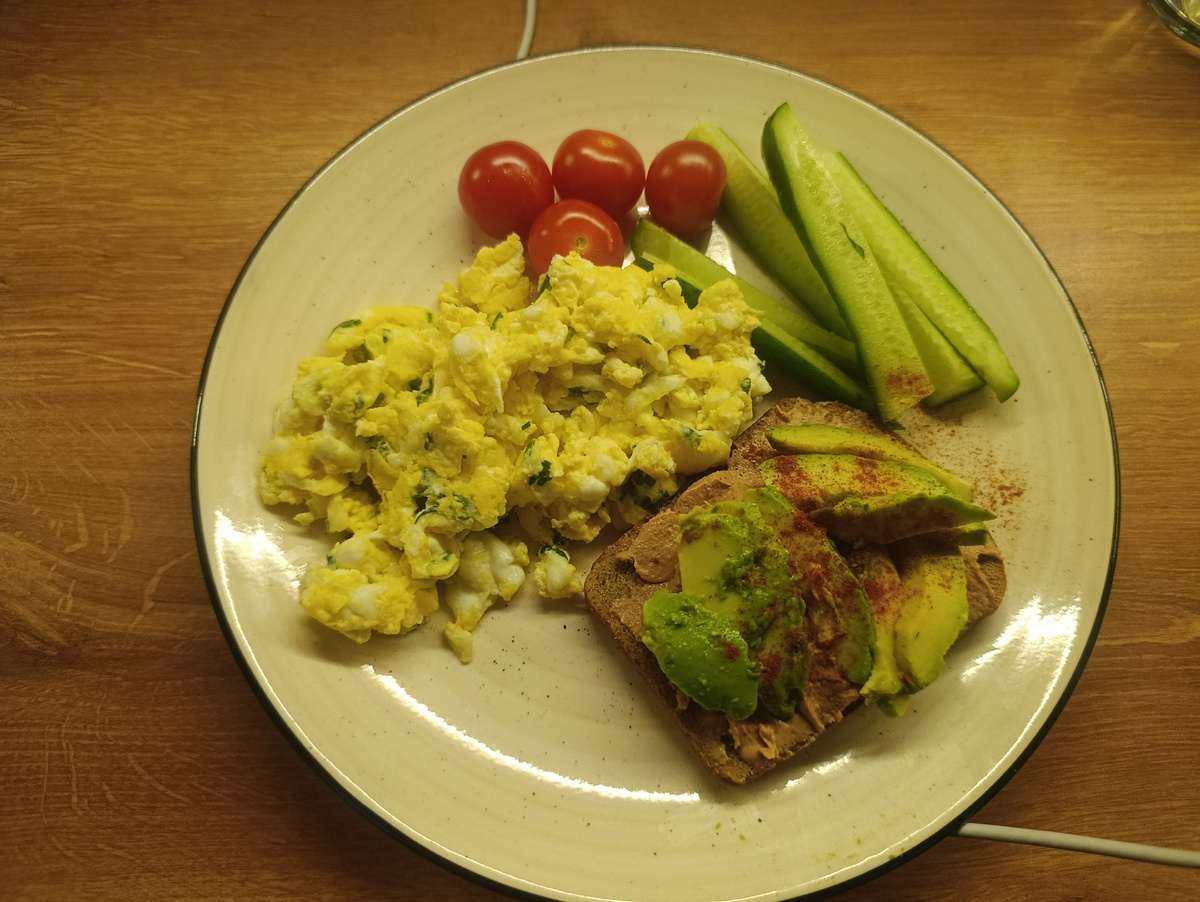Достаточно белка, вкусно. Хлеб на завтрак допустим. Авокадо - источник полезных жиров.