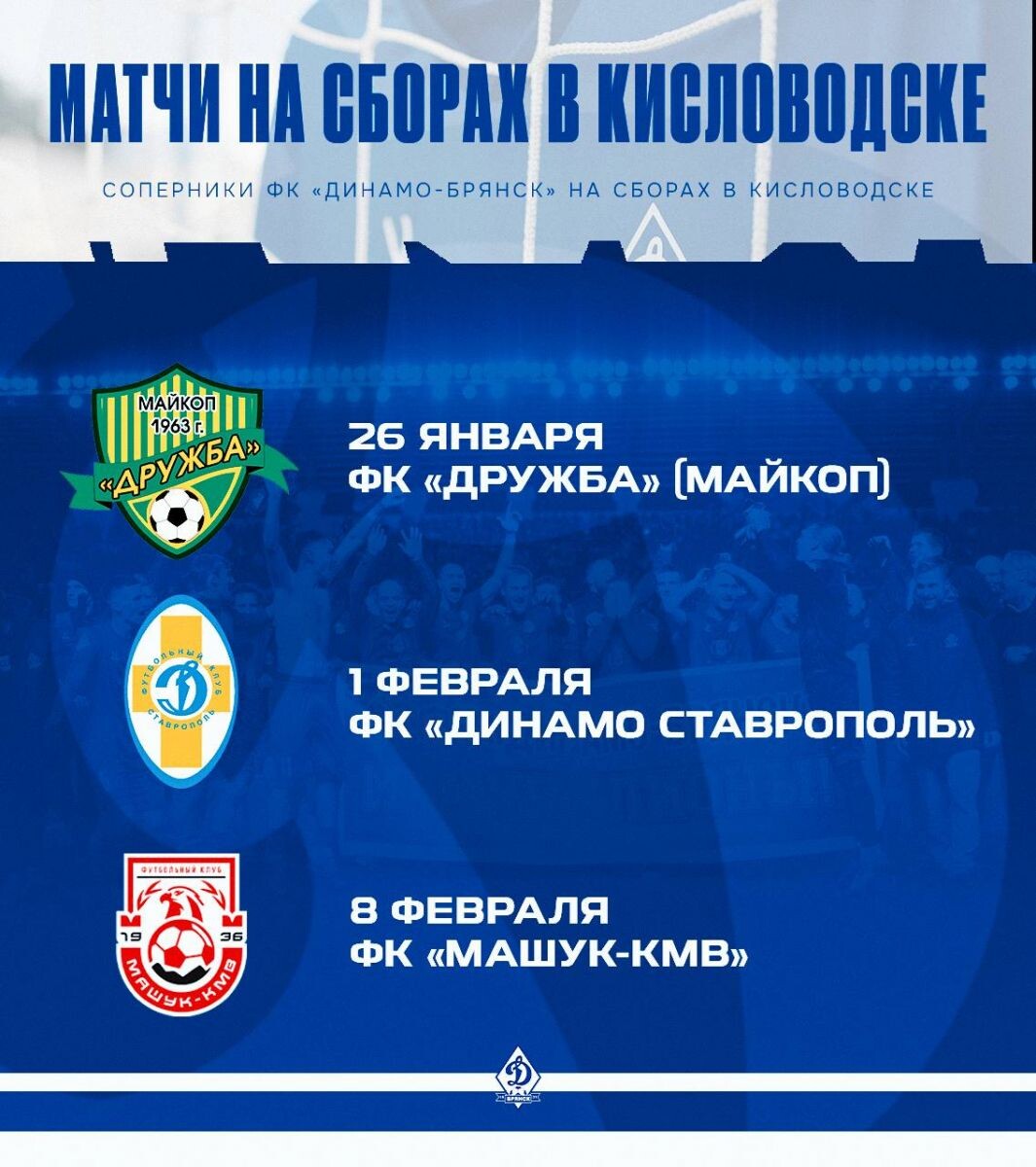 Стали известны соперники брянского «Динамо» по контрольным матчам на тренировочных сборах в Кисловодске. 26 января брянская команда сыграет против майкопской «Дружбы»; 1 февраля пройдёт матч против «Динамо Ставрополь»; а 8-го февраля «Динамо-Брянск» встретится с пятигорским ФК «Машук-КМВ». Напомним, что сегодня стало известно, что состав брянского «Динамо» пополнил воспитанник Академии ФК «Краснодар» Лев Алимов. 0+