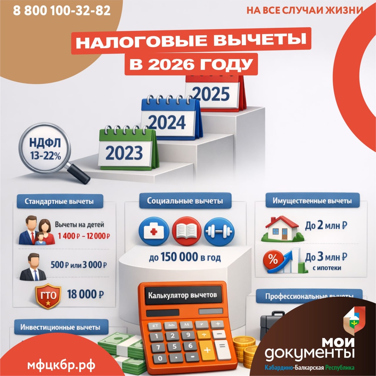 Вычет положен налоговым резидентам РФ, которые получают доход, облагаемый НДФЛ по ставкам 13-22%. Оформить налоговый вычет можно через работодателя, налоговую инспекцию (лично) или в упрощенном порядке (онлайн). Стандартные вычеты Предоставляются для отдельных категорий граждан, а также родителей несовершеннолетних детей или студентов-очников до 23 лет. Размер вычетов: - на ребенка: 1 400 рублей — на первого, 2 800 рублей — на второго, 6 000 рублей — на третьего и следующих, 12 000 рублей — на ребенка с инвалидностью - на себя: 500 рублей или 3 000 рублей (в зависимости от льготной категории) - за сдачу нормативов ГТО: 18 000 рублей Изменения 2026 года: ✅Вычет на детей предоставляется, пока доход физлица с начала года не превысит 450 000 рублей. ✅С 2026 года для получения вычета за ГТО не обязательно проходить диспансеризацию. Вместо этого можно проходить профилактические медосмотры. Социальные вычеты Предоставляются при оплате лечения, обучения, спорта, страхования и других услуг