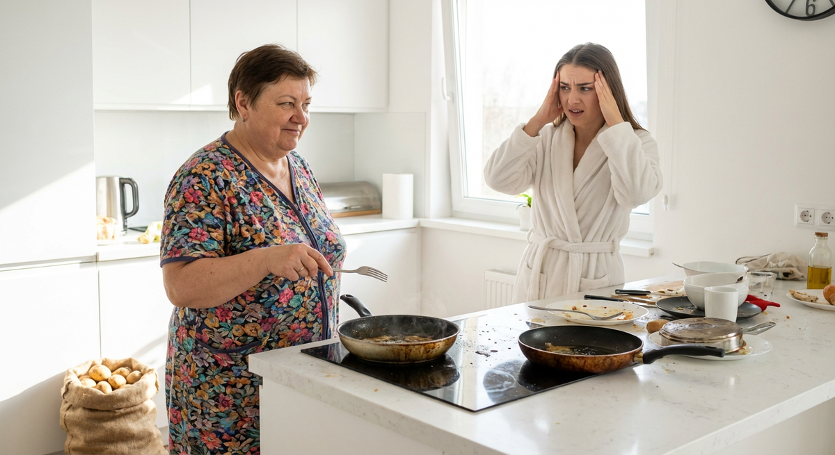 На кухне царил хаос. На моей идеальной столешнице из искусственного камня, которую я берегла как зеницу ока, лежала разделочная доска с салом, а рядом – крошки хлеба прямо на поверхности. Тетка Валя в своем цветастом халате стояла у плиты и жарила что-то шкворчащее на моей любимой сковороде с антипригарным покрытием. Я с ужасом заметила, что она мешает еду железной вилкой.