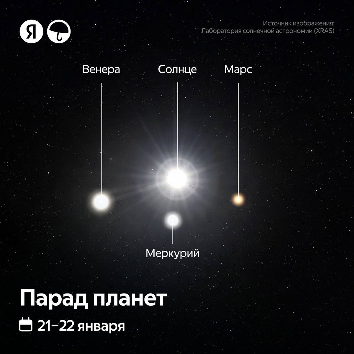 🪐 В ночь с 21 на 22 января на небе будет захватывающее явление — вокруг Солнца соберутся сразу три планеты: Меркурий, Венера и Марс. Небесные тела выстроятся в почти идеальный ромб или крест. Вертикальную ось фигуры образуют Солнце и Меркурий, а горизонтальную — Венера и Марс. Такая симметричная форма — большая редкость 🤩 После максимального сближения планет, парад начнёт рассыпаться: первым от Солнца отойдёт Меркурий, а в феврале удалятся Венера и Марс. К сожалению, насладиться зрелищем в полной мере будет непросто: интенсивный солнечный свет существенно затруднит наблюдение, буквально «затмевая» планеты 🌞 Источник tg.me/yandex_weather Наш канал в Max, вступайте Источник: Открыть