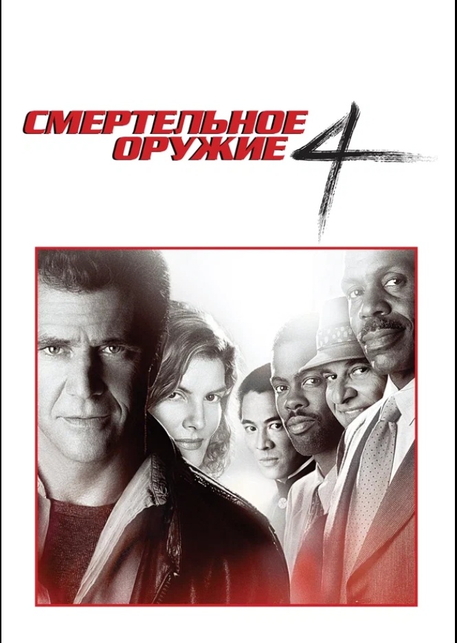 «Смертельное оружие 4» — финальная часть популярной франшизы о полицейских‑напарниках, снятая Ричардом Доннером. В главных ролях: Мэл Гибсон (Мартин Риггс), Дэнни Гловер (Роджер Мерто). На этот раз герои сталкиваются с международной преступной сетью, занимающейся подделкой валюты и нелегальной иммиграцией. К команде вновь присоединяются Лео Гетц (Джо Пеши) и Лорна Коул (Рене Руссо), а главным антагонистом становится мастер боевых искусств Ван Синь Ку (Джет Ли) — его первая заметная роль в голливудском кино.