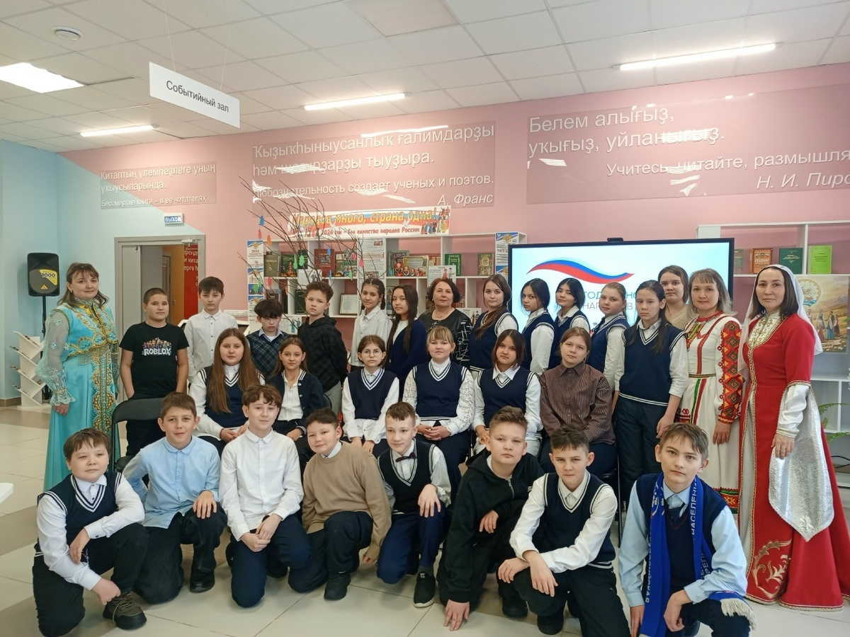 Сегодня в Межпоселенческой центральной библиотеке состоялось торжественное открытие Года единства народов России. Это событие положило начало целому циклу мероприятий, направленных на укрепление дружбы, взаимного уважения и взаимопонимания между представителями разных культур, проживающих в нашей стране. Для обучающихся 6 «Б» класса АСШ №1 был проведен урок дружбы «Под одним голубым небом». Библиотекари познакомили ребят с богатым многообразием культурного наследия России, рассказали о единстве судеб народов, населяющих нашу многонациональную Родину. В ходе встречи звучали стихотворения и песни, прославляющие дружбу народов и их общую историю. Особым моментом стало принятие учащимися символической клятвы единства, в которой они подтвердили свою приверженность принципам уважения, толерантности и сотрудничества. Ярким символом мероприятия стало «Дерево единства». Ребята украсили его разноцветными листьями разной формы и размера — как знак дружбы, доброты и взаимного уважения между народа
