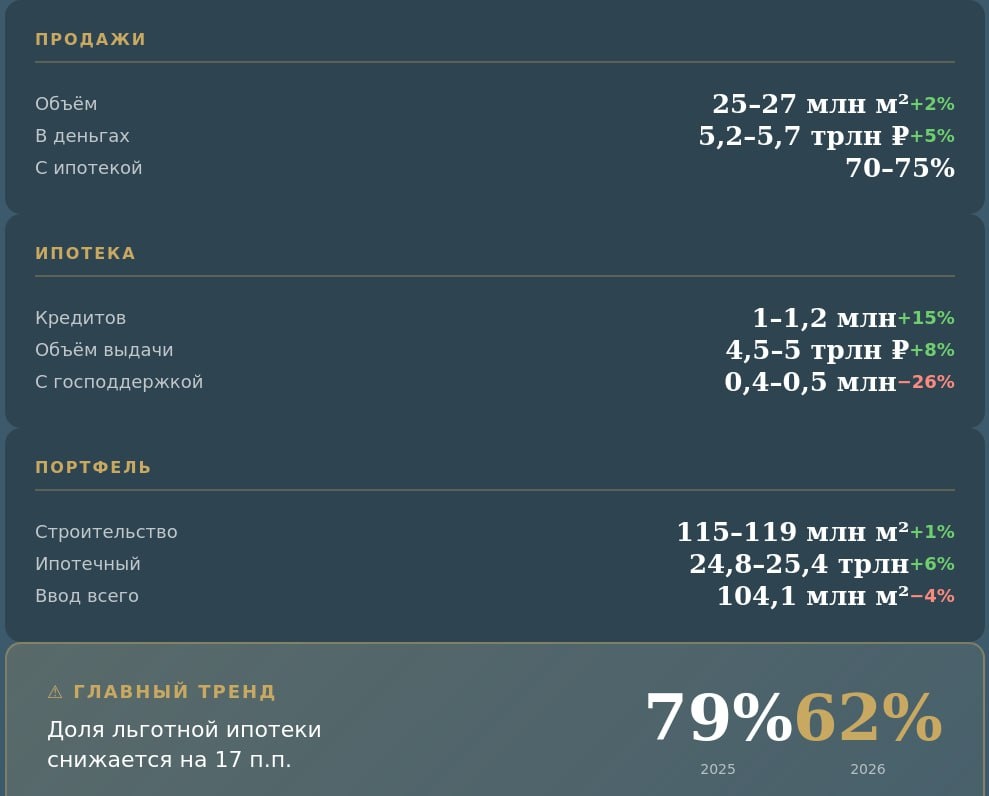 »? Свежая аналитика от «Дом.РФ» — разбираем ключевые цифры. Что будет с новостройками: Запуск новых проектов вырастет на 4% — до 41–45 млн кв.м Ввод многоквартирных домов прибавит 8% — до 47,8 млн кв.м А вот ИЖС просядет на 11% — до 56,3 млн кв.м Что будет с продажами: Объём продаж +2% — до 25–27 млн кв.м В деньгах +5% — до 5,2–5,7 трлн рублей 70–75% сделок пройдут с ипотекой Что будет с ипотекой: Выдадут 1–1,2 млн кредитов — это +15% к 2025 году Объём выдачи — 4,5–5 трлн рублей (+8%) ⚠️ Главное изменение: Доля льготной ипотеки упадёт с 79% до 62% Это минус 17 процентных пунктов за год Что это значит на практике: Льготные программы сужаются. Тем, кто ещё может воспользоваться семейной ипотекой — лучше не откладывать. Условия будут только жёстче. Согласны с прогнозом? Или слишком оптимистично? 👇