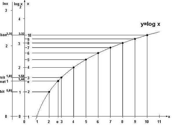 Сравнение разных единиц измерения информации. Дискретные величины представлены прямоугольниками, единица «нат» — горизонтальным уровнем. Чёрточки слева — логарифмы натуральных чисел.