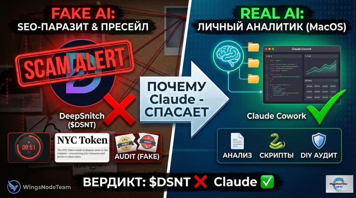 Почему $DSNT хочет ваши деньги, а Claude - спасает их. В продолжении вчерашних новостей 👆👆👆 Команда WingsNodeTeam провела глубокий форензик-анализ (Deep Dive) двух проектов: хайпового пресейла DeepSnitch ($DSNT) и нового обновления Claude Cowork. Результаты вас удивят (или расстроят, если вы уже купили $DSNT). 🚩 ЧАСТЬ 1: DeepSnitch ($DSNT) - Анатомия "SEO-Паразита" Мы копнули глубже таймера на сайте. Вот что нашли: 1. Паразит на теле NYC Token: Вы видели эти статьи? "Эрик Адамс соскамился... покупайте DeepSnitch!". Это не новости, это Programmatic SEO. Проект использовал скандал с мэром Нью-Йорка, чтобы перехватить трафик напуганных инвесторов. Циничный маркетинг, рассчитанный на хомяков. 2. Аудит Шредингера: Они машут бумажками от Coinsult и SolidProof. 🔵Факт: Эти аудиторы проверяют синтаксис (чтобы токен переводился), а не бизнес-логику (чтобы вас не кинули). В отчетах прямым текстом написано: "Мы не гарантируем защиту от rug-pull". Значок аудита на сайте DeepSnitch - это