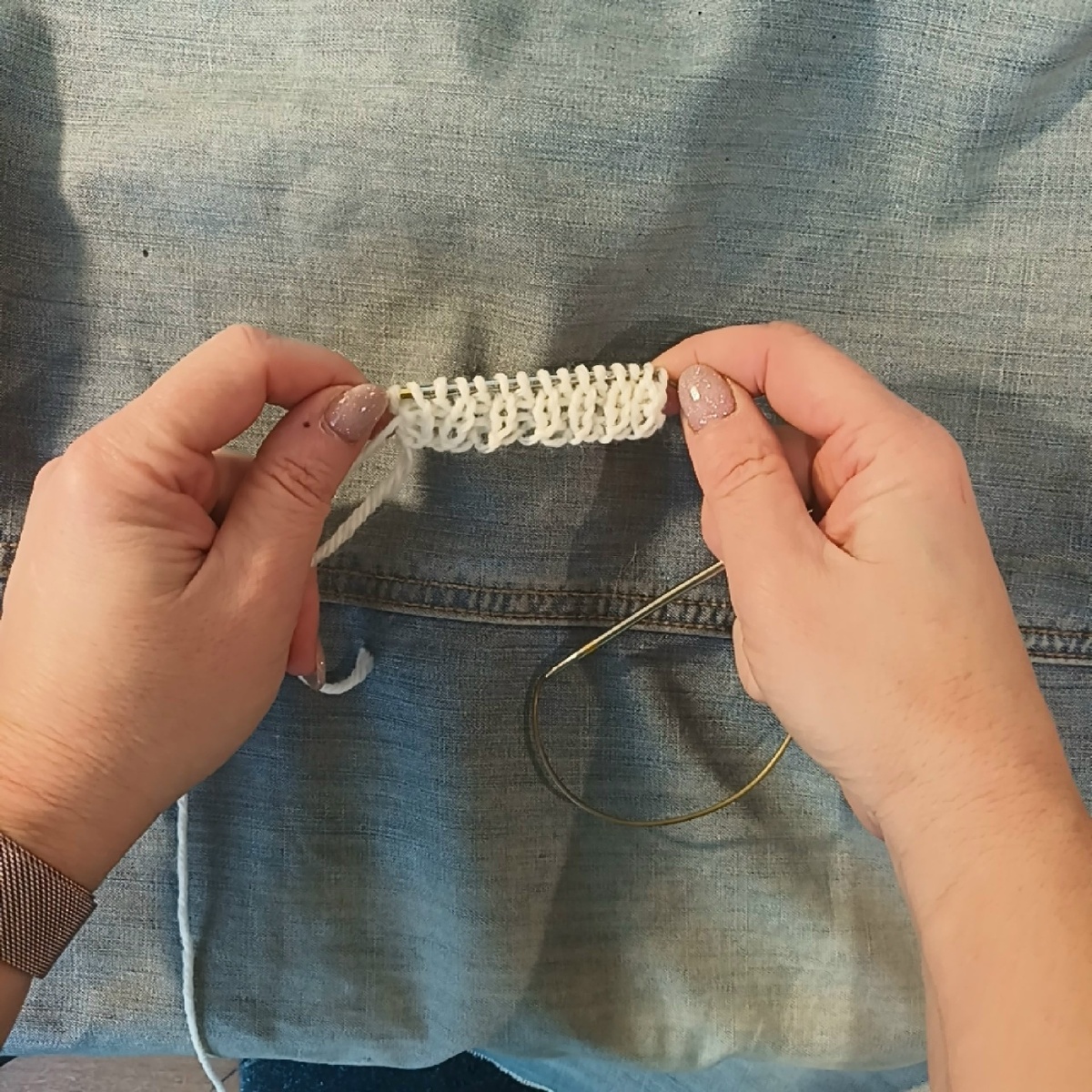 У этого набора полно поклонников. Как правило, они не вяжут. И основная причина популярности - очень высокая эластичность. Поэтому его "среда обитания" - детские вещи. Рассмотрим поближе. Это набор короткого хвоста, что, несомненно, удобно. Начинается он со скользящей петли. По окончании набора скользящую петлю иногда сбрасывают. Я не вижу в этом ни малейшего смысла, так как набор и состоит из скользящих петель. Накидываем нить на пальцы. Цепляем нить перед указательным пальцем. Формируем петлю. Заводим спицы в петлю. Цепляем нить у большого пальца. Заводим сквозь петлю в обратном направлении. Плотно прижимаем петлю на спице к ранее сформированным петлям. И затягиваем нить. Так выглядит набор и полотно, связанное от этого набора. Теперь пара слов о плюсах и минусах. Плюсы - высокая эластичность и отсутствие необходимости отмерять хвост для набора. Набор годится для любого узора, но в силу эластичности обычно используется для резинок. Минус - этот набор нетехнологичен. Он не прощает ош