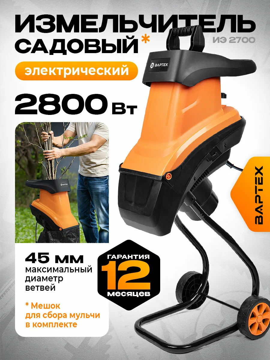 Измельчитель садовый электрический Вартех ИЭ 2700 — ваш личный помощник для идеального порядка в саду. Он легко превратит груду обрезанных веток толщиной до 4.5 см в полезную мелкую щепу за секунды.