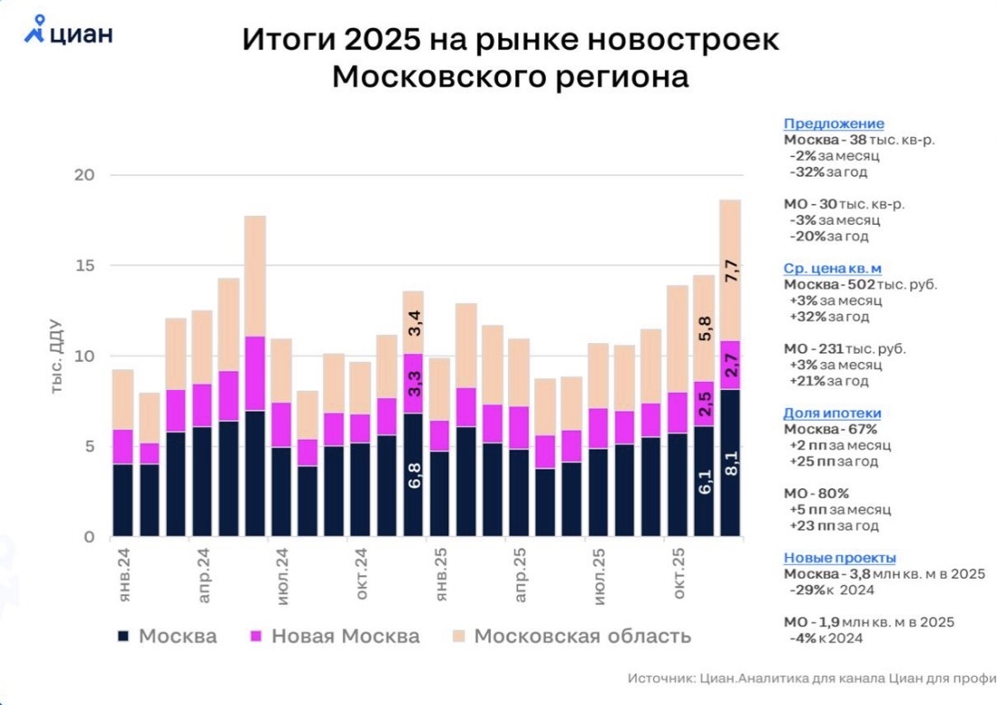 В декабре 2025 на первичном рынке Москвы и Московской области было заключено 18.6 тыс. ДДУ (+29% к ноябрю и это 4-й (!) результат в истории).