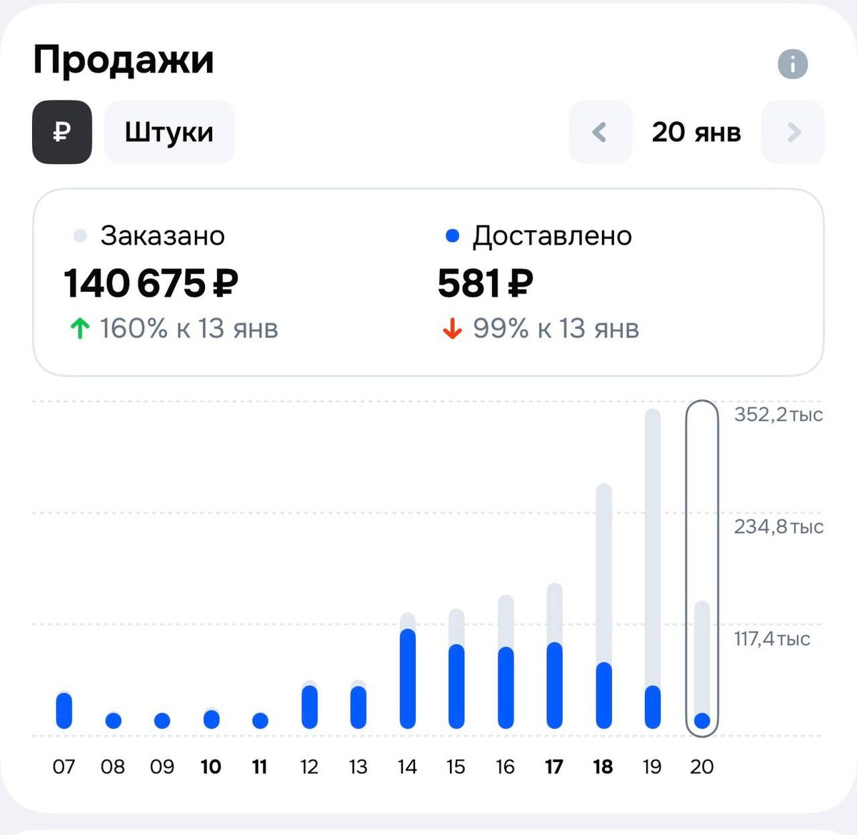Вчера зафиксировали исторический максимум по проекту — 350k за день. Сегодня осознанно снизились до ~150k. Это не откат и не «сломалось». Это управляемое решение. Почему так произошло? Во-первых, не все склады оказались готовы к такому объёму. Когда рост происходит резко, логистика почти всегда начинает отставать — это нормально. Во-вторых, конкуренты оказались в шоке. Кто-то начал резко менять цены, кто-то дергать ставки, кто-то просто метаться. Рынку нужно время, чтобы переварить перераспределение заказов. Почему мы сознательно сбавили обороты? На этом этапе важно не максимизировать оборот любой ценой, а сохранить контроль над процессами. Неконтролируемый рост: • ломает склады, • портит СВД, • бьёт по выкупу, • создаёт хаос внутри проекта. Лучше сделать шаг назад под контролем, чем продолжать давить и потом разгребать последствия неделями. Что по состоянию проекта? Все ключевые показатели — в норме. Реклама работает, позиции держатся, спрос есть. Сейчас задача: • стабилизи