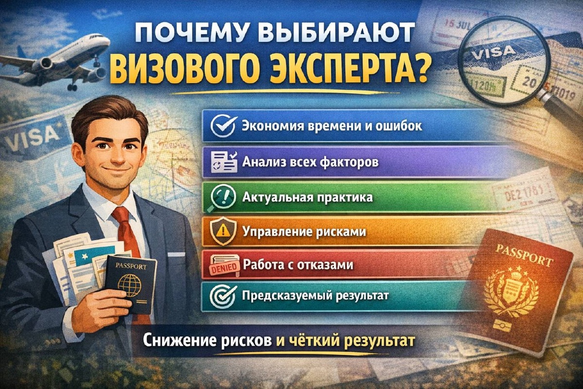 ? Работу с визовым экспертом выбирают не ради удобства, а ради снижения рисков и предсказуемого результата. Эксперт — это не «помощник по заполнению анкеты», а человек, который понимает как именно принимается визовое решение и управляет этим процессом. Ключевые причины выбора эксперта 1. Экономия времени и снижение ошибок Эксперт: - знает, какие документы реально важны; - исключает лишние действия и повторы; - предотвращает критические ошибки, которые часто приводят к отказам. Самостоятельная подача чаще экономит деньги, но почти всегда увеличивает риск. 2. Работа с совокупностью факторов Визовое решение принимается не по одному документу, а по комплексу факторов: - визовая история; - финансы; - цель поездки; - условия подачи; - логика маршрута; - обстоятельства заявителя. Эксперт оценивает весь кейс целиком, а не отдельные пункты. 3. Актуальная практика, а не теоретические правила Эксперт: - знает, что сейчас работает, а что — нет; - учитывает изменения, которые ещё не отраже