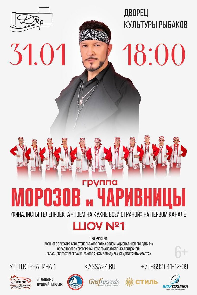 Концерт финалистов телепроекта «Поём на кухне всей страной»группы «МОРОЗОВ и ЧАРИВНИЦЫ» Программа «Шоу № 1» — не просто новые песни и уже полюбившиеся хиты, а настоящее шоу: живой звук, эффектная хореография, впечатляющие спецэффекты и, конечно же, незабываемая атмосфера, наполненная искренними чувствами,посвященный 10-летию совместной творческой деятельности. Погрузитесь в мир музыки вместе с заслуженным артистом Севастополя Дмитрием Морозовым и любимой группой! Откройте для себя новые грани музыкального искусства! В программе также принимают участие: Военный оркестр Севастопольского полка войск национальной гвардии РФ Образцовый хореографический ансамбль «Калейдоскоп» Образцовый хореографический ансамбль «Дива» Студия танца «Марта» 👉 Когда? 31 января в 18:00 👉 Где? Ул. П. Корчагина,1 👉 Касса ДКР: +7(869)241-12-09 👉 Подробности по ссылке https://clck.ru/3R2Pzg ✨Давай сходим, Севастополь | Читайте и смотрите нас в МАХ
