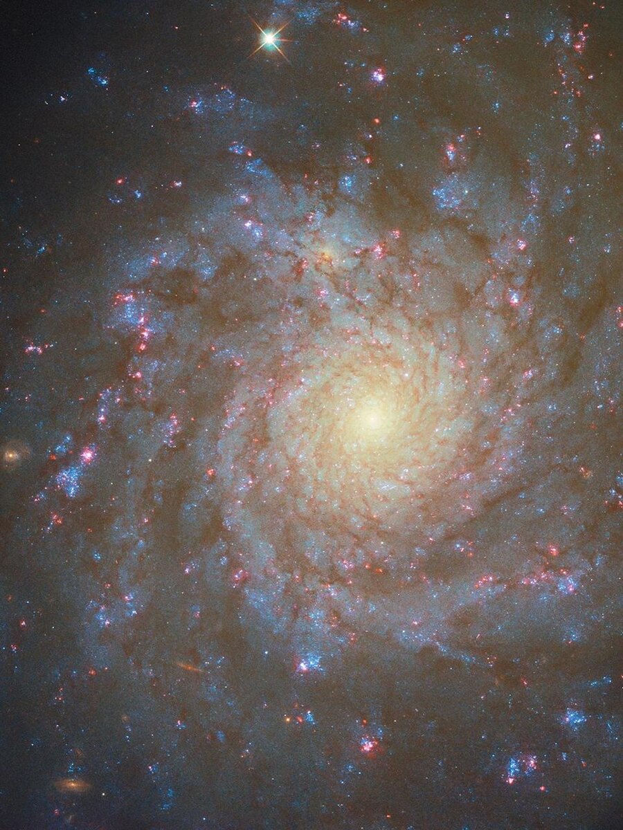 Она доминирует сценой перистыми спиральными рукавами и сверкающими кластерами звезд. Факт: галактика открыта У. Гершелем в 1787 году и входит в скопление Девы, теряя газ из-за межгалактической среды. Пыльные рукава усеяны яркими розовыми туманностями с массивными молодыми звездами. Облака нагреты до 10 000 K ультрафиолетом от ядер звезд, но рождение происходит в холодных молекулярных комплексах размером десятки–сотни световых лет при температуре 10–20 K над абсолютным нулем. Факт: такие гигантские молекулярные облака содержат 10^5–10^6 солнечных масс, коллапсируя под собственной гравитацией за 1 миллион лет. Факт: низкая скорость звездообразования в NGC 4571 — 1 M☉/год — указывает на переход от спирали Sa к раннему типу по классификации де Вокулёра.