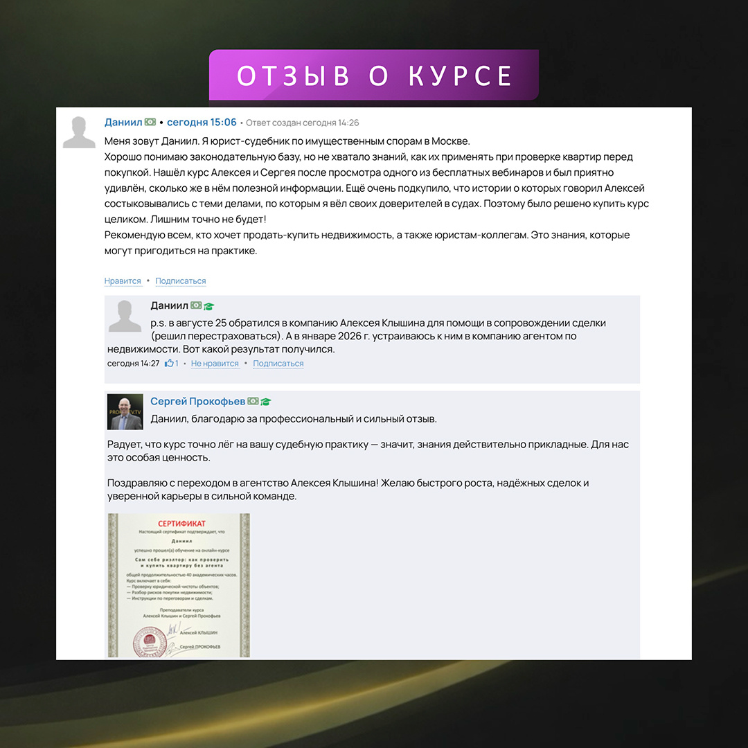 Отзыв о курсе "Сам себе риэлтор: как проверить и купить квартиру без агента" от Даниила Меня зовут Даниил. Я юрист-судебник по имущественным спорам в Москве. Хорошо понимаю законодательную базу, но не хватало знаний, как их применять при проверке квартир перед покупкой. Нашёл курс Алексея и Сергея после просмотра одного из бесплатных вебинаров и был приятно удивлён, сколько же в нём полезной информации. Ещё очень подкупило, что истории о которых говорил Алексей состыковывались с теми делами, по которым я вёл своих доверителей в судах. Поэтому было решено купить курс целиком. Лишним точно не будет! Рекомендую всем, кто хочет продать-купить недвижимость, а также юристам-коллегам. Это знания, которые могут пригодиться на практике. Нравится • Подписаться P.S. в августе 25 обратился в компанию Алексея Клышина для помощи в сопровождении сделки (решил перестраховаться). А в январе 2026 г. устраиваюсь к ним в компанию агентом по недвижимости. Вот какой результат получился.