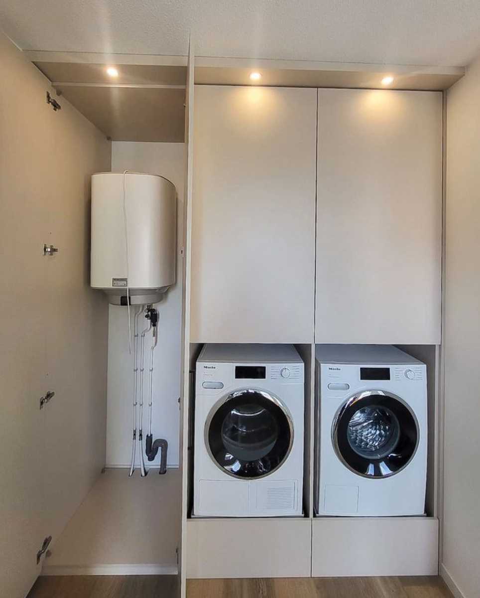 - Отдельная мини-прихожая или технический шкаф: решение для квартир с большим пространством, полностью скрывает котел и трубы, удобно для обслуживания.