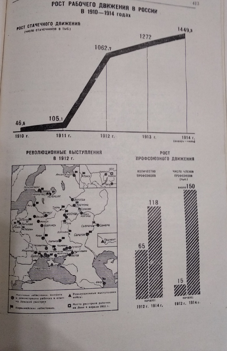 В 1913 году рабочее движение поднялось на новую высоту. По официальным данным, бастовало 861.000 рабочих. По более полным данным рабочей печати, в забастовках участвовало 1 272.000 человек. Первое место по размаху стачечного движения занимал Петербург, затем шли Москва, Рига , Ревель. В стачечной борьбу вступали новые районы: Западный край, Поволжье, Донбасс, Кавказ. Массовые политические стачки произошли 9 января, в день годовщины ленского расстрела, а также 1 мая. В революционной маевке 1913 года участвовало 420.000 рабочих, из них 250.000 в одном Петербурге.