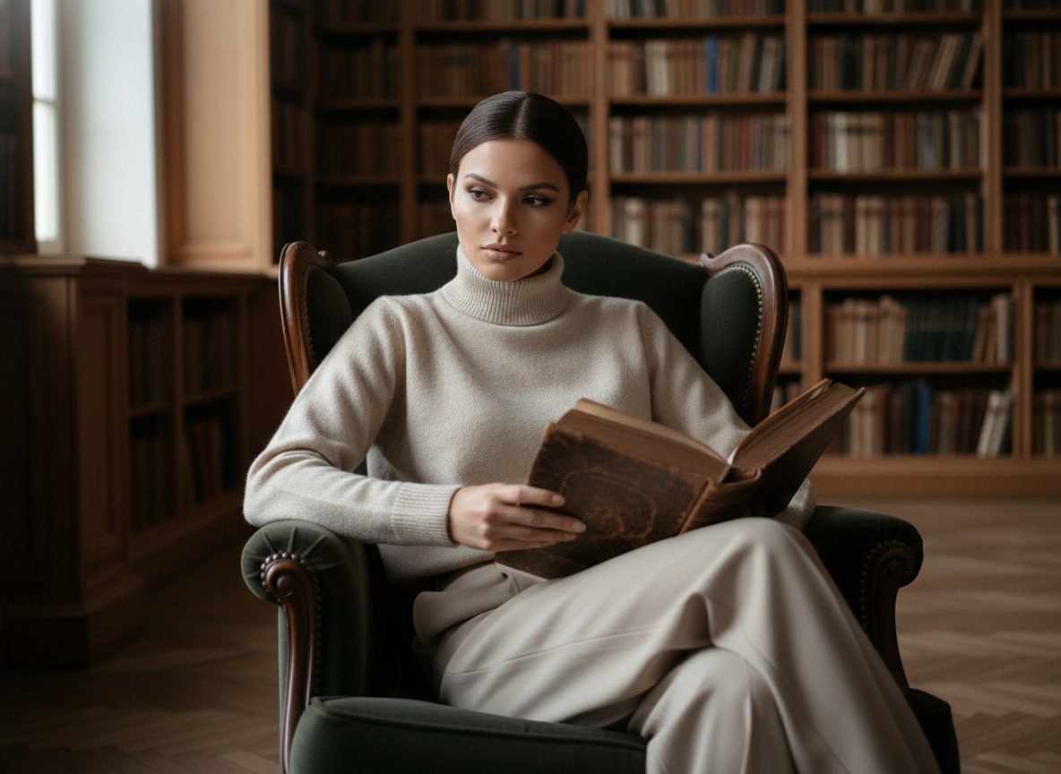 🔥 Никаких пентхаусов, только чистый стиль и комфорт. ⚡️ Добавляем атмосферу уединения, запах старых книг и мягкий свет. Промпт про эстетику «тихой роскоши» и внутренний покой. Закидывай селфи в @SnapToVideo_bot — этот вариант выглядит куда душевнее. Пробуем! 🌚 Используя загруженное селфи в качестве точного эталона лица со 100-процентным совпадением (--face_fidelity 1.0), создайте фотографию по описанию, сохранив полное сходство с оригиналом. [Эстетичный художественный портрет] женщины в [интерьере старинной библиотеки с высокими деревянными стеллажами]. Она [задумчиво сидит в глубоком винтажном кресле]. Одета в [светло-бежевый кашемировый свитер с высоким горлом и широкие шерстяные брюки в тон]. [Мягкий естественный свет из окна] создает глубокие тени и подсвечивает текстуру ткани. В руках [открытая книга в старом переплете]. [Крупный план, малая глубина резкости, эффект пленки]. Фотореалистично, 8k, объектив 50mm f/1.4. Как менять: 👀 🎯 Ракурс (замени [крупный план...]): - Вари