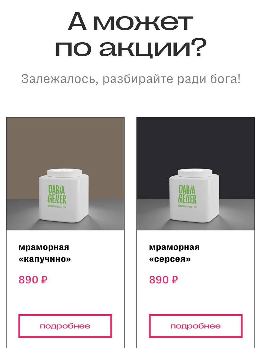 У бренда DARIA GEILER есть все для качественной перекраски мебели, стен, потолков, плитки и других поверхностей. срочное включение🔥 у нас сниженная цена на мраморные краски 500 мл, заказываем на сайте и WB. мы сокращаем коллекцию мраморных красок и снижаем цены для обновления полок, смело хватайте 😍 📎мраморные краски на WB: «капучино» - https://www.wildberries.ru/catalog/231615784/detail.aspx?size=365526524 «бессердечный кардиолог» - https://www.wildberries.ru/catalog/231615784/detail.aspx?size=365526524 «серсея» - https://www.wildberries.ru/catalog/159414968/detail.aspx?size=265165779 «устала ждать» - https://www.wildberries.ru/catalog/231615789/detail.aspx?size=365526529 «марсиане, изучайте» - https://www.wildberries.ru/catalog/221642742/detail.aspx?size=352061583 Мраморные краски созданы для перекраски мебели и предметов интерьера. Их отличает высокая укрывистость даже ярких оттенков. Наносится на окрашенную или лакированную поверхность, в т.ч. ранее окрашенную, глянцевую, оцинк