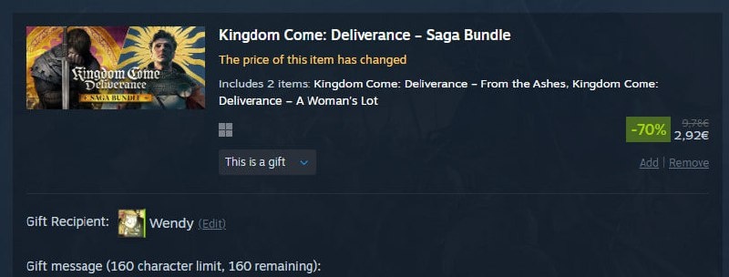 Если у получателя есть часть контента из набора, его стоимость вычитается из общей суммы. При этом некоторые бандлы могут показываться по полной цене при открытии, но при добавлении в корзину скидка применяется корректно. #steam@inyoueyes