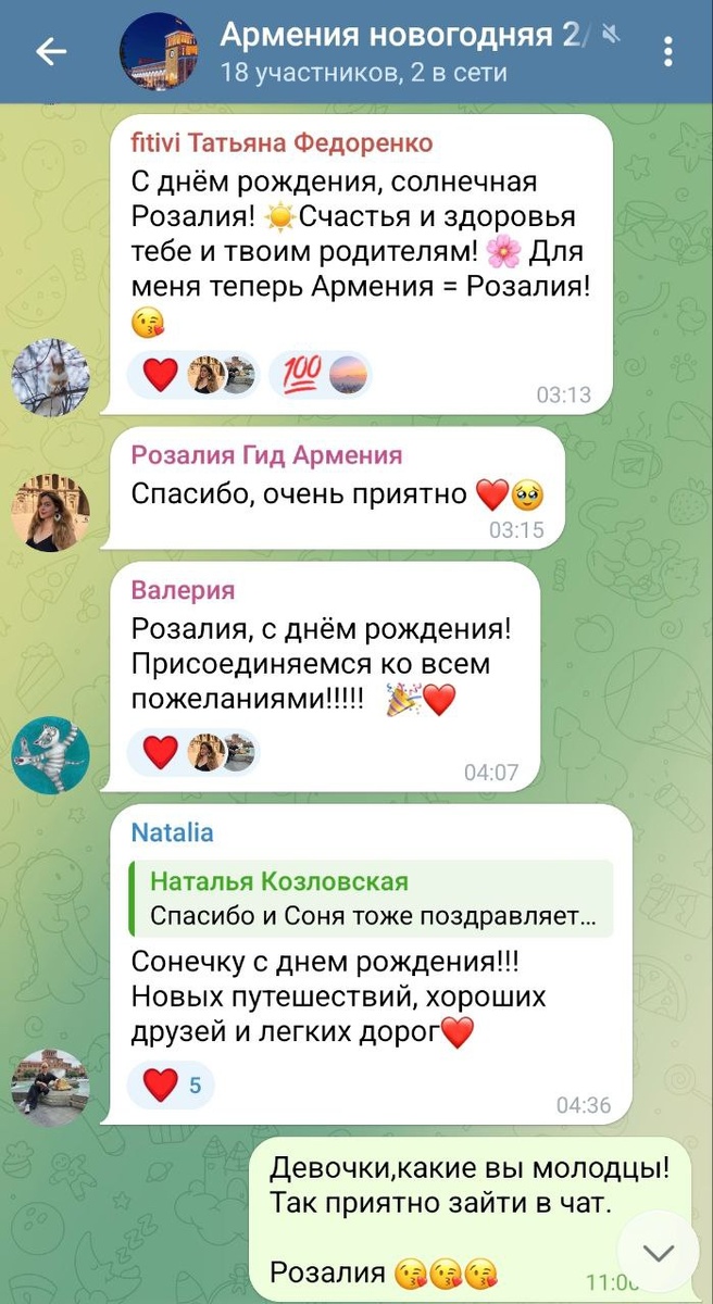 То на душе становится очень тепло. Столько приятных слов - вся группа поздравляет экскурсовода с днём рождения! Кто бывал в Армении с Розалией - присоединяйтесь! А ещё вот от этого становится очень-очень радостно. Розалия = Армения Значит, мы смогли найти классного проводника для знакомства со страной. У нас все получилось! А значит, повторим! Армения 6- 9 марта Программа https://dzen.ru/media/uletimru/znaete-kogda-posle-pereleta-zahodish-v-chat-i-vidish-takoe-696fb0c4e9d14a04278d52f8 6-10 мая Программа https://dzen.ru/media/uletimru/znaete-kogda-posle-pereleta-zahodish-v-chat-i-vidish-takoe-696fb0c4e9d14a04278d52f8 Бронь у меня 👇 @IrinaPolezhaeva