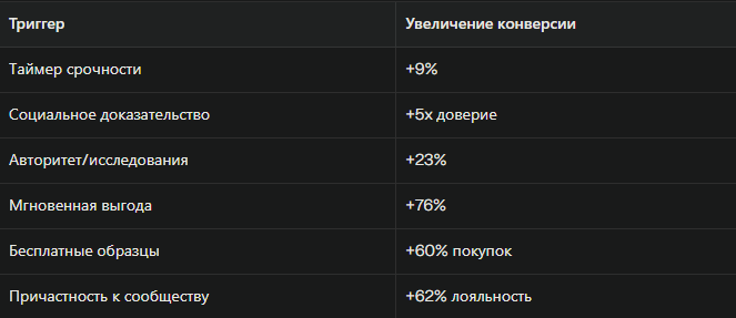 Конверсионные триггеры — это психологические рычаги, которые заставляют человека совершить покупку прямо сейчас. Они действуют не на логику, а на эмоции: страх, жадность и желание быть в тренде. Факт: 95% решений о покупке принимаются подсознательно. Триггеры апеллируют именно к этому подсознательному уровню, обходя критическое мышление. Когда клиент видит, что предложение доступно ограниченное время — его мозг входит в режим паники. 56% пользователей испытывают дискомфорт, пропуская выгодные предложения. 60% миллениалов совершают покупку в течение 24 часов после FOMO. Как применить: Таймер обратного отсчета повышает конверсию на 9%. Пример: «Закажи в течение 2 часов и получи бесплатную доставку». Люди хотят делать то же самое, что и другие. Отзывы реальных клиентов повышают доверие в 5 раз. Когда потенциальный покупатель видит, что 1000 человек уже купили товар — сомнения исчезают. Как применить: Отзывы, рейтинги звёздочками, показатель «158 человек из вашего города смотрят этот товар