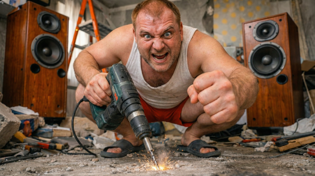 Конфликт начался банально. Соседи посчитали, что мужчина сделал ремонт с нарушениями. Возможно, снес не ту стену, может, затронул общие коммуникации. Детали остаются за кадром, но реакция оказалась масштабной. Вместо того чтобы разбираться в инстанциях или просто игнорировать претензии, мужчина выбрал акустическую атаку.