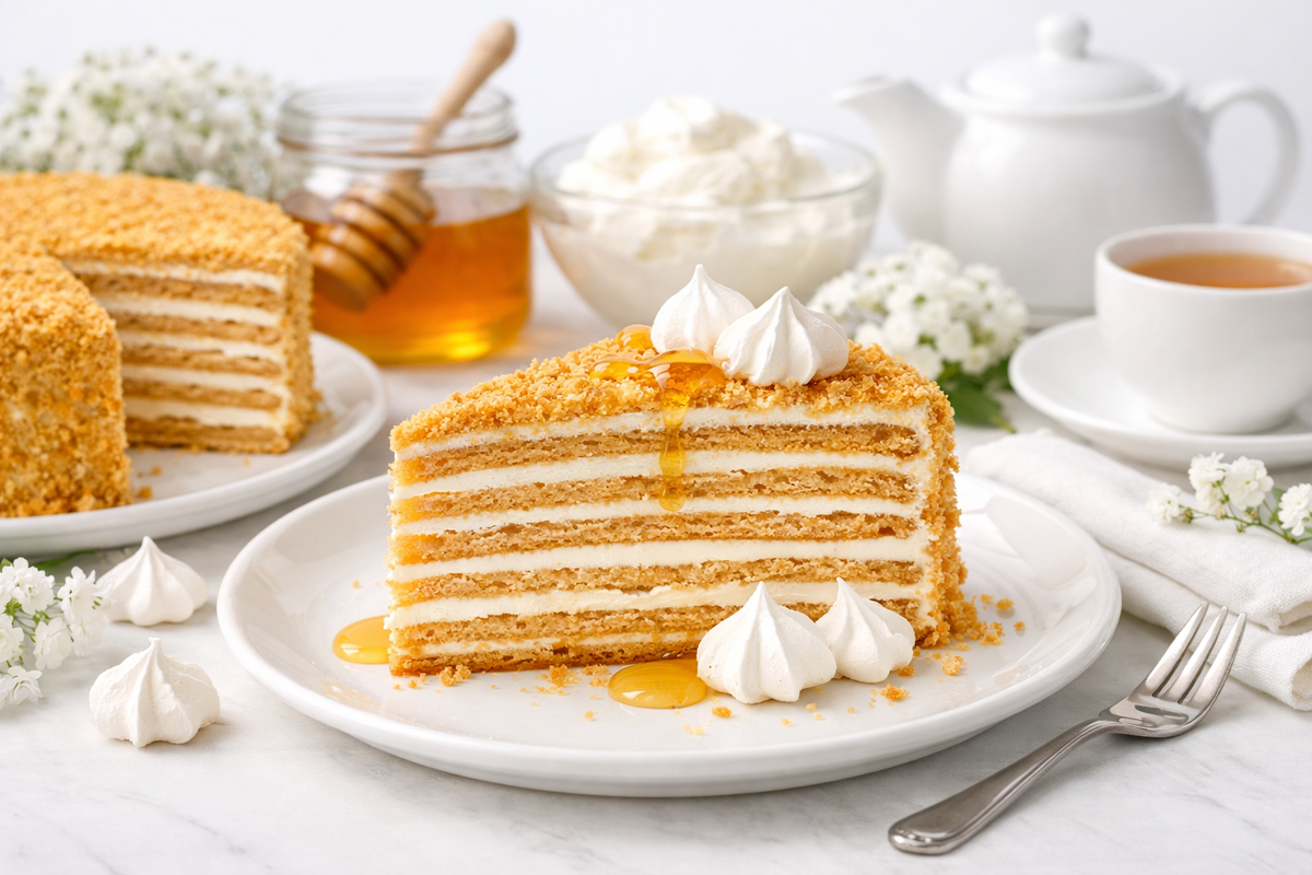 Этот медовик я пеку, когда хочется домашнего торта, но без ощущения тяжести. Тонкие коржи, нежный пломбирный крем и мягкая сладость меда. Он получается воздушным, аккуратным и очень уютным. Такой торт хорош и для выходных, и для гостей.