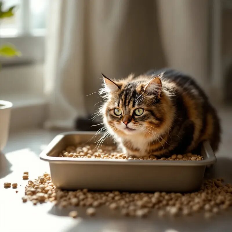 - Мусор вокруг лотка: Легкие опилки и гранулы часто выносятся на лапах.