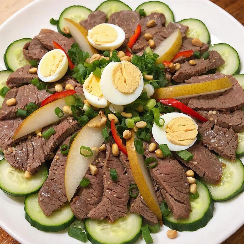 Эта освежающая закуска сочетает в себе нежную говядину, хрустящие огурцы и сладкую грушу, заправленные ароматным соусом.