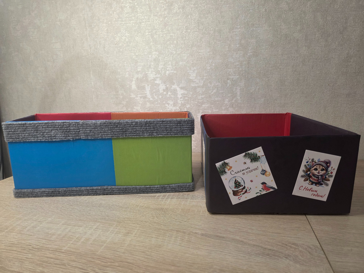 В городе долгими зимними вечерами времени для рукоделия и творчества больше, чем в деревне. Знаю по себе, долгое время жила в деревне и очень скучаю по тому времени: времени уюта, покоя, тишины и размеренности. В деревне ведь как: каждая вещь обязательно пригодится для чего-либо еще, какой-то переделки и послужит рачительным хозяевам дома. Вот опять собралась задекорировать коробки лоя сбора пластиковых крышечек и макулатуры, т.е. сделать простые органайзеры. Здесь у меня остатки цветной бумаги, милые маленькие открытки и коврик-когтеточка для кошки на липкой основе. Декор самый простой: оклеить боковинки цветной бумагой и приклеить открыточки или сделать бордюры из самоклеющегося коврика. Готово!!! Делали с дочкой, Благодатное время: болтаешь, учишься работать в команде, работаешь руками и головой, предлагаешь идеи, учишься делать красивые фото и т.д.