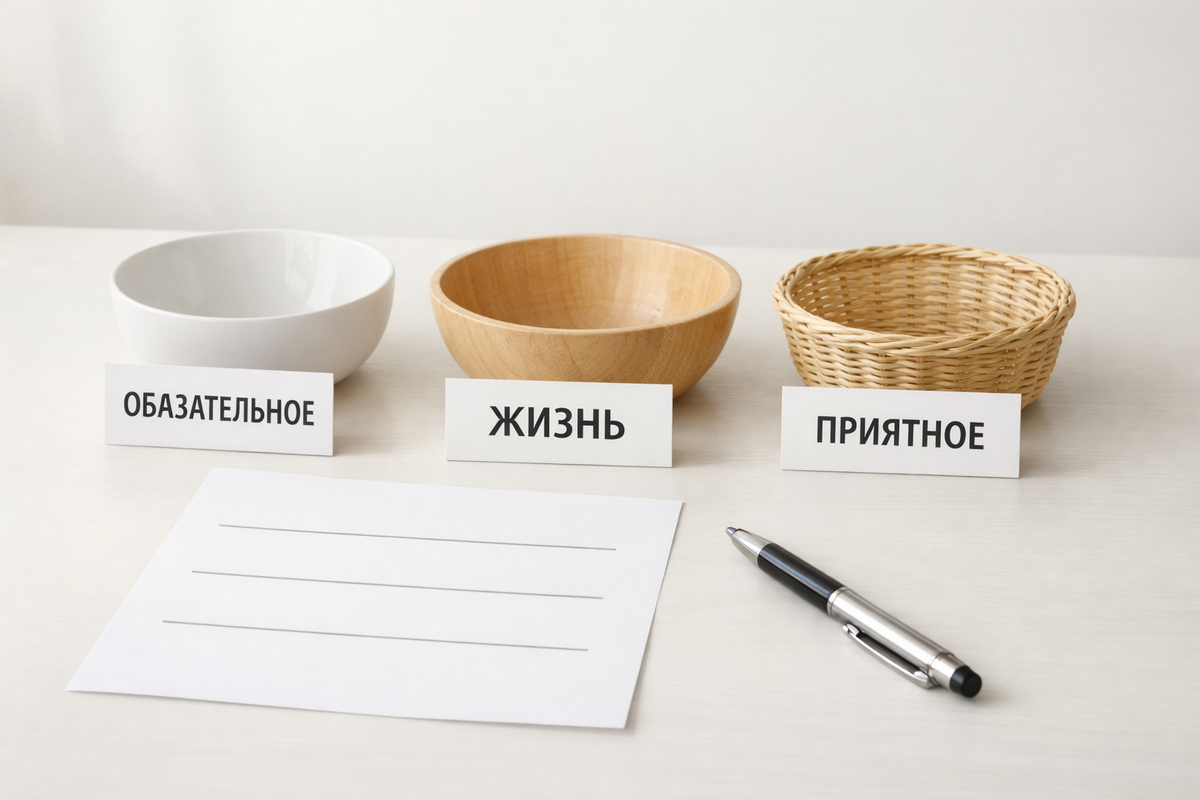 Но бюджет может быть очень спокойным: не про “запреты”, а про понимание, куда уходят деньги — и где можно облегчить себе жизнь. Давайте сделаем вариант, который занимает 15 минут в неделю. Откройте заметки и напишите три строки: Это и есть ваш бюджет. Не таблица. Три строки. Потому что: Нам нужен бюджет, который живёт вместе с вами. Коммуналка, связь, кредиты/рассрочки, лекарства, то, что “не обсуждается”. Продукты, транспорт, бытовое, то, что нужно каждый день. Подарки, кафе, маленькие радости, “хочу”. Эта схема хороша тем, что она не требует точности до рубля. Откройте расходы за 7 дней и ответьте себе: Не идеально, на глаз — достаточно. Обычно это: Задача — не убрать всё, а выбрать одну дырочку. Не запрет, а замена.