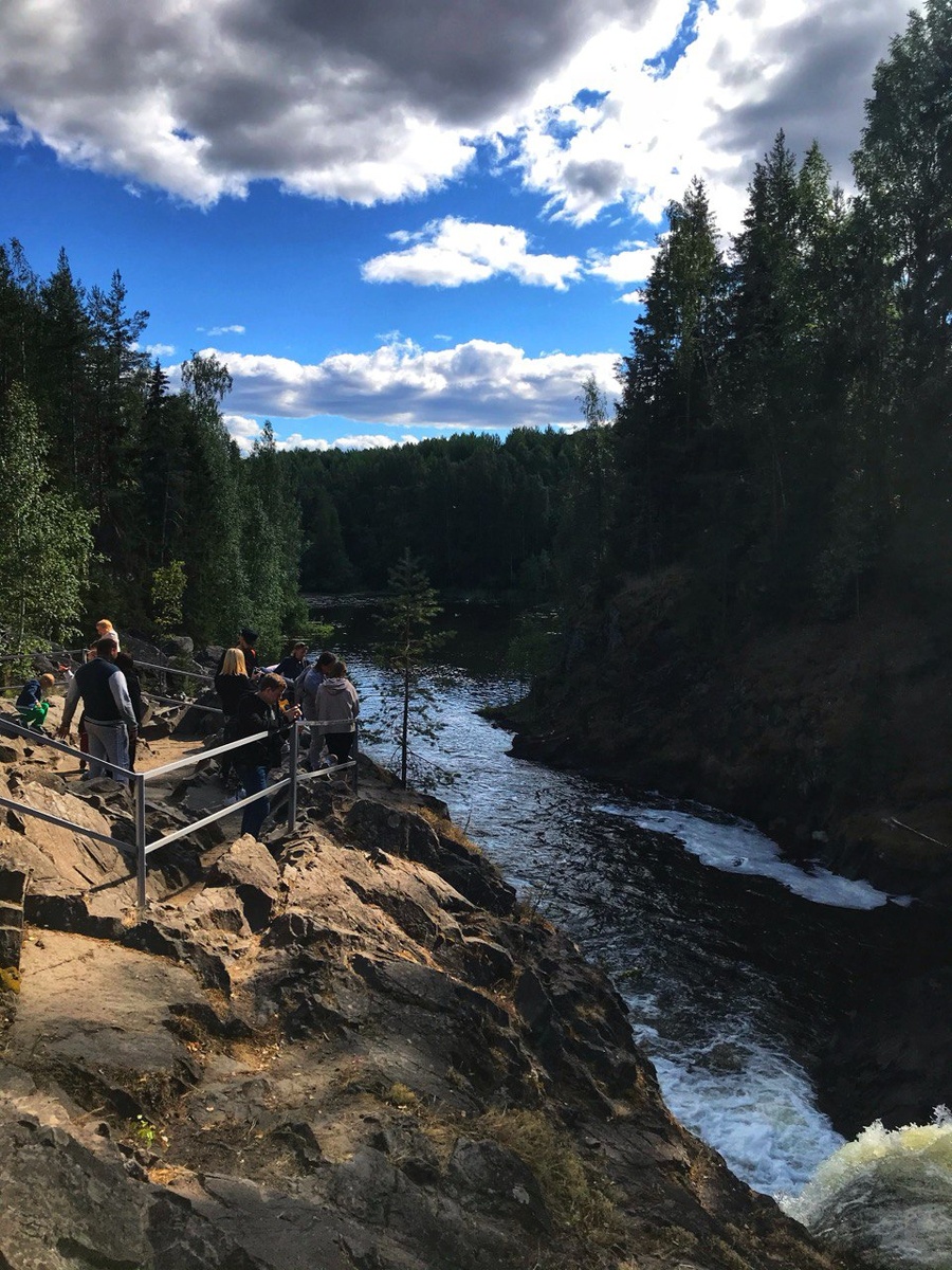Наша поездка на водопад кивач состоялась летом этого года. Проезжая по трассе "кола" (трасса Санкт-Петербург-Мурманск), примерно посередине можно свернуть на пару километров влево и оказаться в природном парке. Вообще в Карелии очень много водопадов: маленькие и большие, но именно этот бурлит особенно. Вход в парк платный. Сразу при входе или после посещения объекта можно перекусить карельскими пирогами и вкусно выпить чаю. Как вы видите на фото, при подходе к водопаду есть ограждение, чтобы не свалится за борт. Хотя вроде бы давно один случай был, когда турист залез на ограждение и упал спиной вниз. Водопад не замерзает, поэтому его можно посетить и зимой. Правда летом это более красиво и красочно. Кстати, дальше по ходу "пьесы" можно прогуляться и найти камни из редкого материала. На выходе из парка есть небольшая игровая "зона" для детей. Это различные сказочные персонажи, представленные в виде огромных фигур. С ними можно сфотографироваться. Есть также качели для поднятия настр