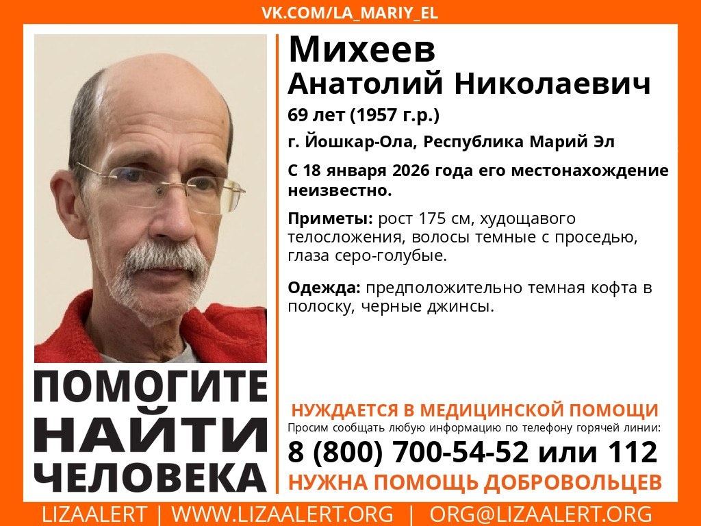 ! Поисковый отряд «ЛизаАлерт» в Марий Эл просит йошкаролинцев помочь найти и вернуть домой пенсионера, который ушел из дома утром без верхней одежды. Анатолий Николаевич нуждается в медицинской помощи. Его приметы: рост 175 см, худощавого телосложения, волосы темные с проседью, глаза серо-голубые. Предположительно был одет в темную кофту в полоску, черные джинсы. 📍Сбор волонтеров с 20:00 на парковке у магазина «Пятерочка» у дома №57 на улице Карла Либкнехта. Координаты: 56.637684, 47.948701.