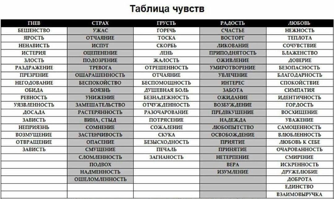 1- неприязнь 2 - отвращение 3 - безысходность 4 - печаль 5 - уважение