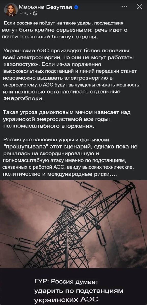 Её обвинили в том, что она фактически раскрыла критически важные объекты. Безуглая предупредила, что поражение ключевых узлов, особенно высоковольтных подстанций и линий, питающих атомные электростанции, может привести к почти полному блэкауту. Она также признала, что АЭС не способны работать автономно: при сбоях передачи энергии в сеть их мощность придётся снижать или останавливать. Политик назвала эту угрозу «дамокловым мечом» над энергосистемой страны.