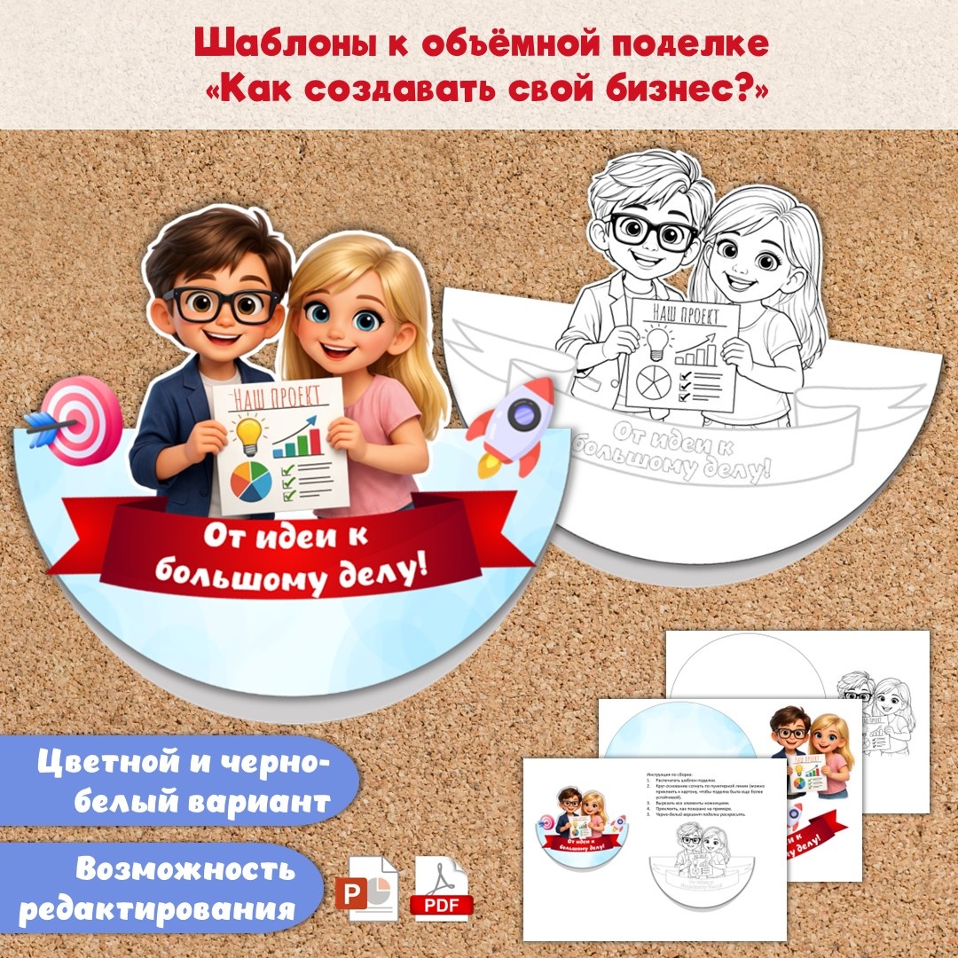 Шаблон к объемной поделке «Как создавать свой бизнес?» для Разговоров о важном, которые пройдут 26 января. Материал содержит шаблоны для изготовления поделок и инструкцию по их изготовлению. Подходит для проведения воспитательных мероприятий, тематических и внеурочных занятий. В комплект входит: Как использовать материал: Чтобы поделка была более устойчивой, используйте картон. Файл в формате PDF и PPTX. Есть возможность редактирования. Каждая деталь в формате png. Можно менять размеры всех деталей. Еще материалы по теме: Оформление «Как создавать свой бизнес?». Разговоры о важном
