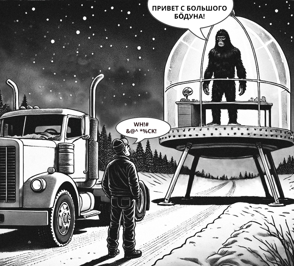 Этот случай произошёл зимой 1975 года, когда Роберт проезжал через Северную Дакоту, что в США. – «Время было позднее, около 23ч. Вдруг рядом с обочиной я заприметил странный объект куполообразной формы. Неподалеку от объекта я остановился, чтобы рассмотреть его более детально. Высота его составляла около 5 метров. По всей окружности купола были прозрачные вставки, словно окна, через которые можно было увидеть пилота инопланетного корабля. Это существо было высокого роста, около 2,5 метров. Все тело пришельца было покрыто густой шерстью тёмного цвета. Отчётливо выделялись крупные глаза и уши, напоминающие свиные. По описанию это существо напоминало мне бигфута, о котором мне неоднократно рассказывал отец. Я наблюдал, как бигфут разгуливал по своему инопланетному кораблю. Заприметив меня существо подошло по всей видимости к пульту управления корабля, после чего, за несколько секунд, инопланетный корабль совершенно беззвучно оторвался от земли. Нижняя часть его засверкала синим цветом и о